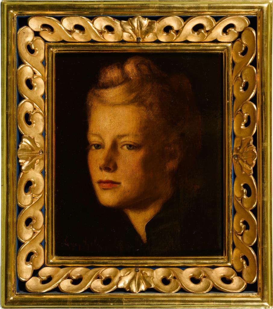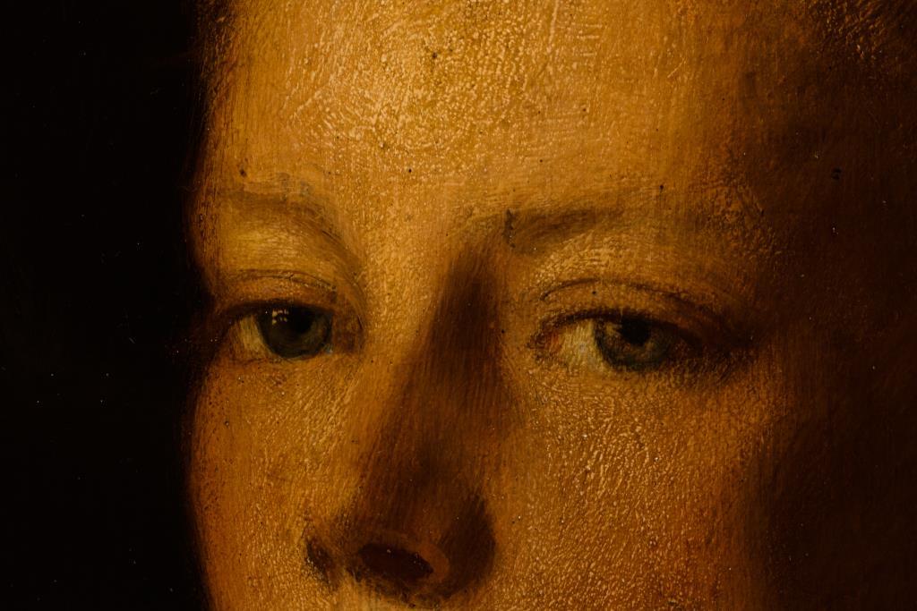 Bildnis einer jungen Frau vor dunklem Hintergrund.