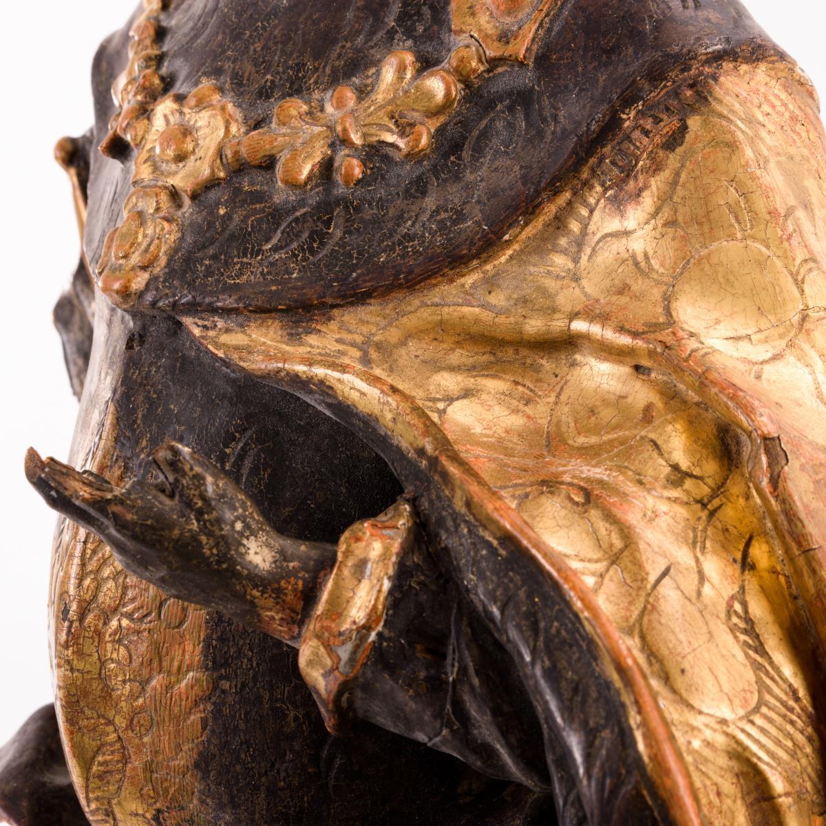 1 Unterarm fehlt, weitere kleinere Fehlstellen, Anobienspuren und Trockenrisse hinten, Alters-/Gebrauchsspuren.