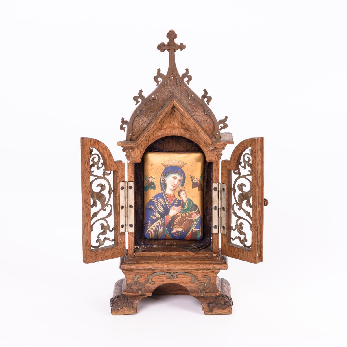 Eiche massiv mit Eisenblech, bemaltes Porzellan, Stoffgrund.
