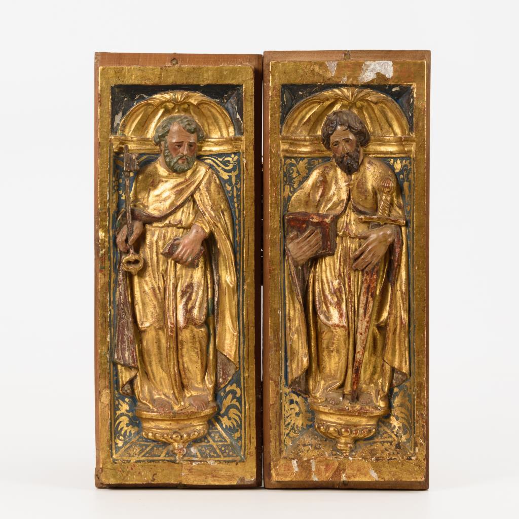 Im Stil der Spätgotik gestaltete Apostel in den Nischen. Farbabplatzer und berieben, minimal retuschiert.