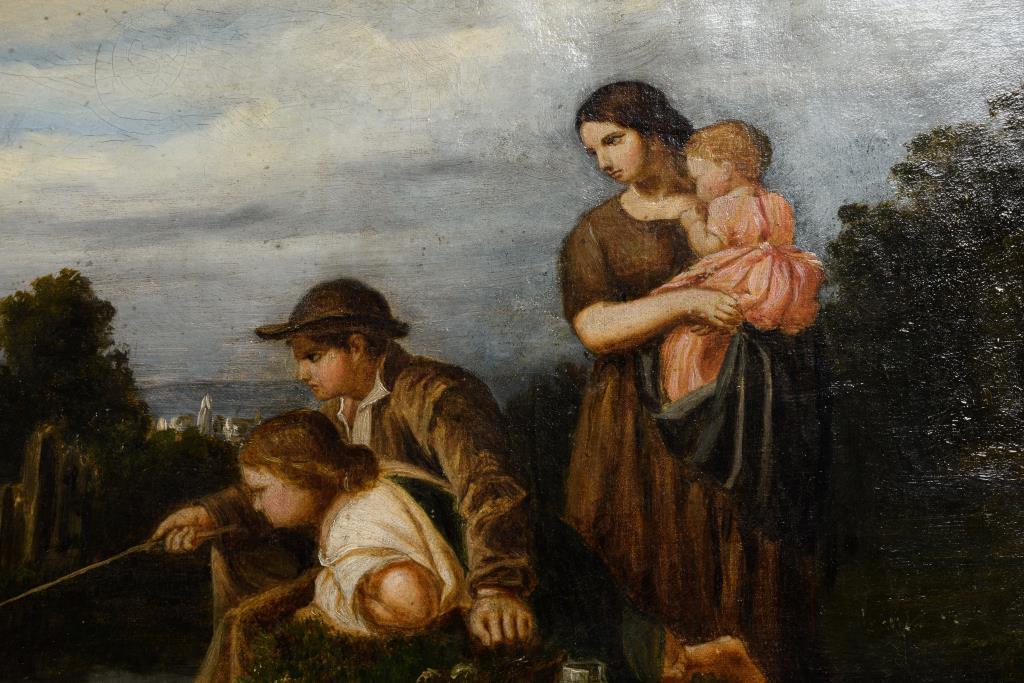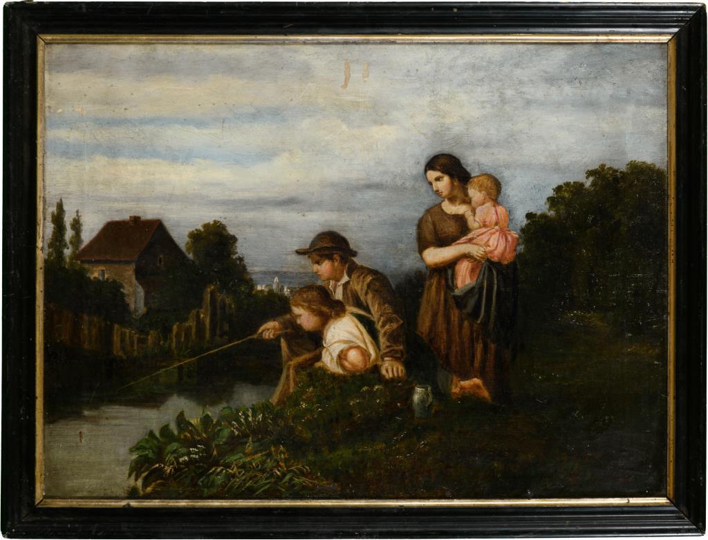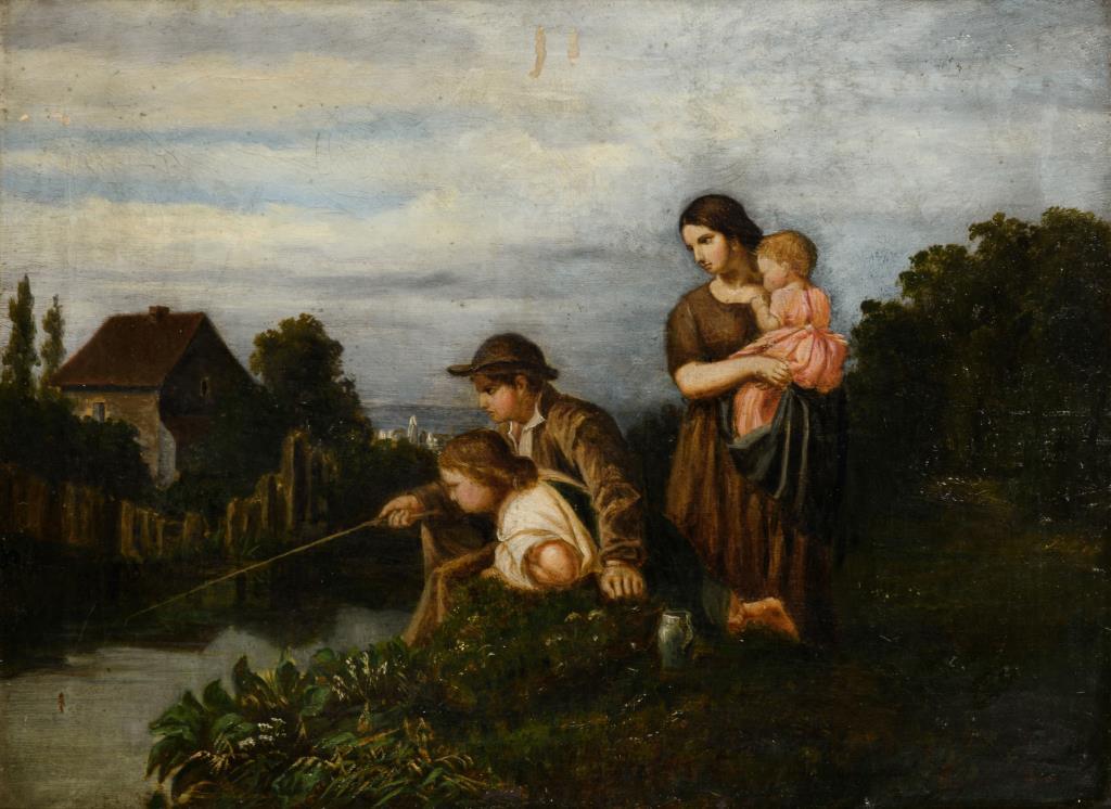 Die Familie mit der Angelrute am Ufer nahe dem Bauernhaus. Altersspuren.