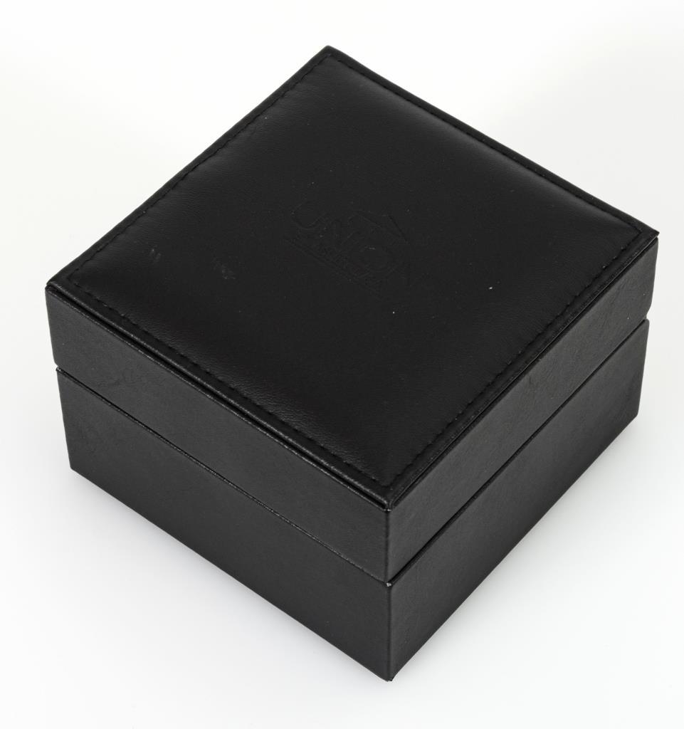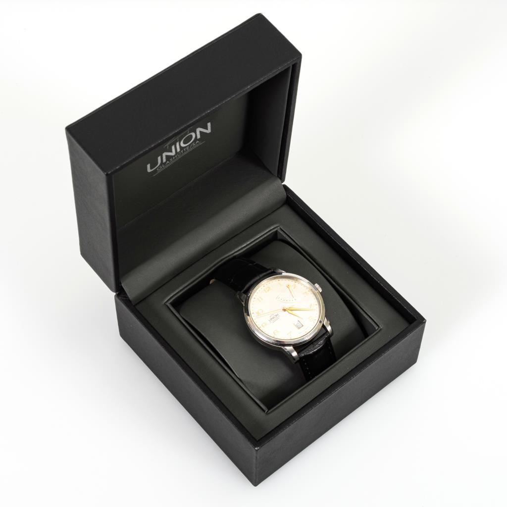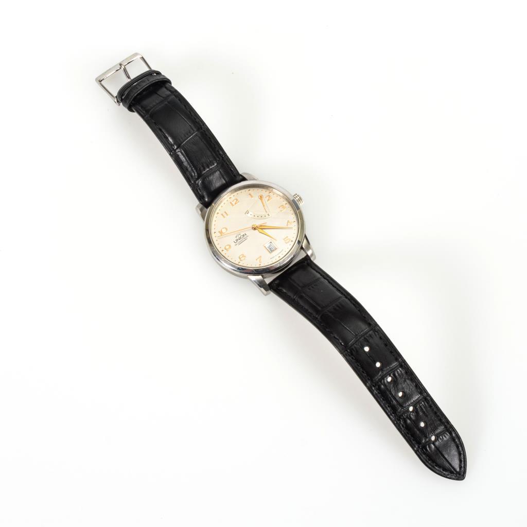 Rundes, satiniertes Gehäuse an schwarzem Lederband. Silbernes Zifferblatt mit goldenen arabischen Zahlen, Minuterie, Zentralsekunde, Datumsanzeige, Gangreserve, Dauphin-Zeiger. Werk läuft.