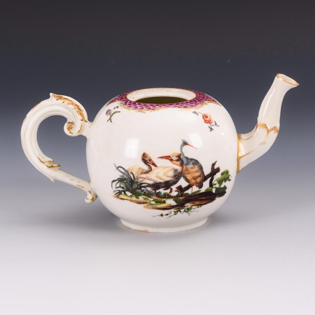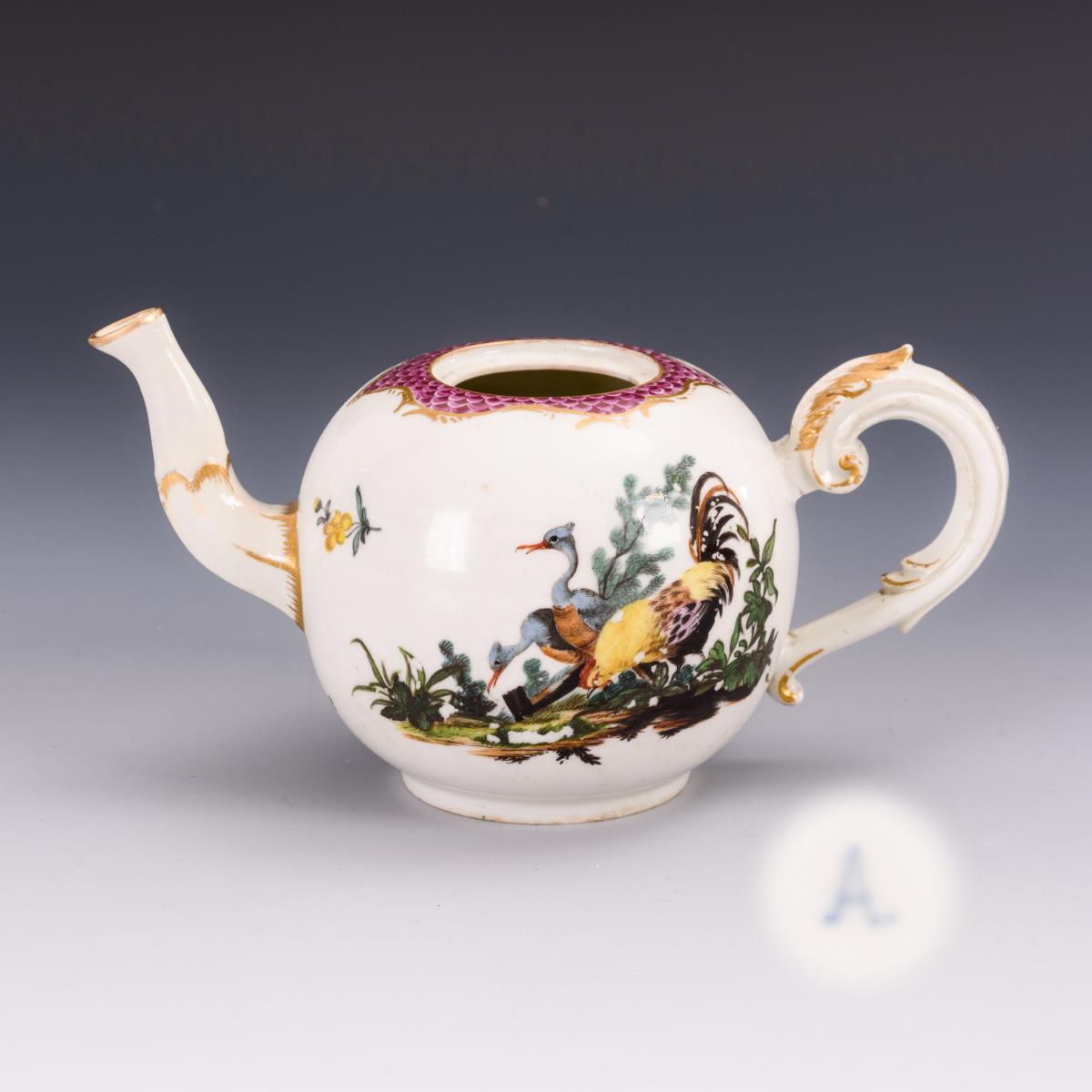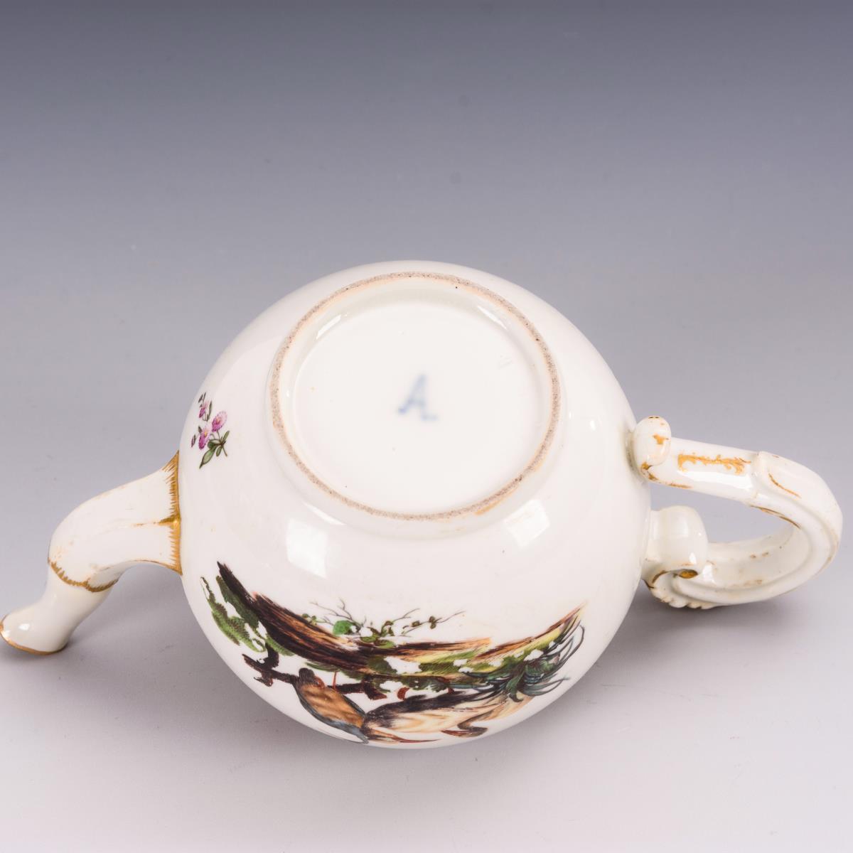 Ohne Deckel. Rand und Ausguss restauriert, Haarriss am oberen Henkelansatz, partieller Goldabrieb, Farbabplatzer in der Malerei.