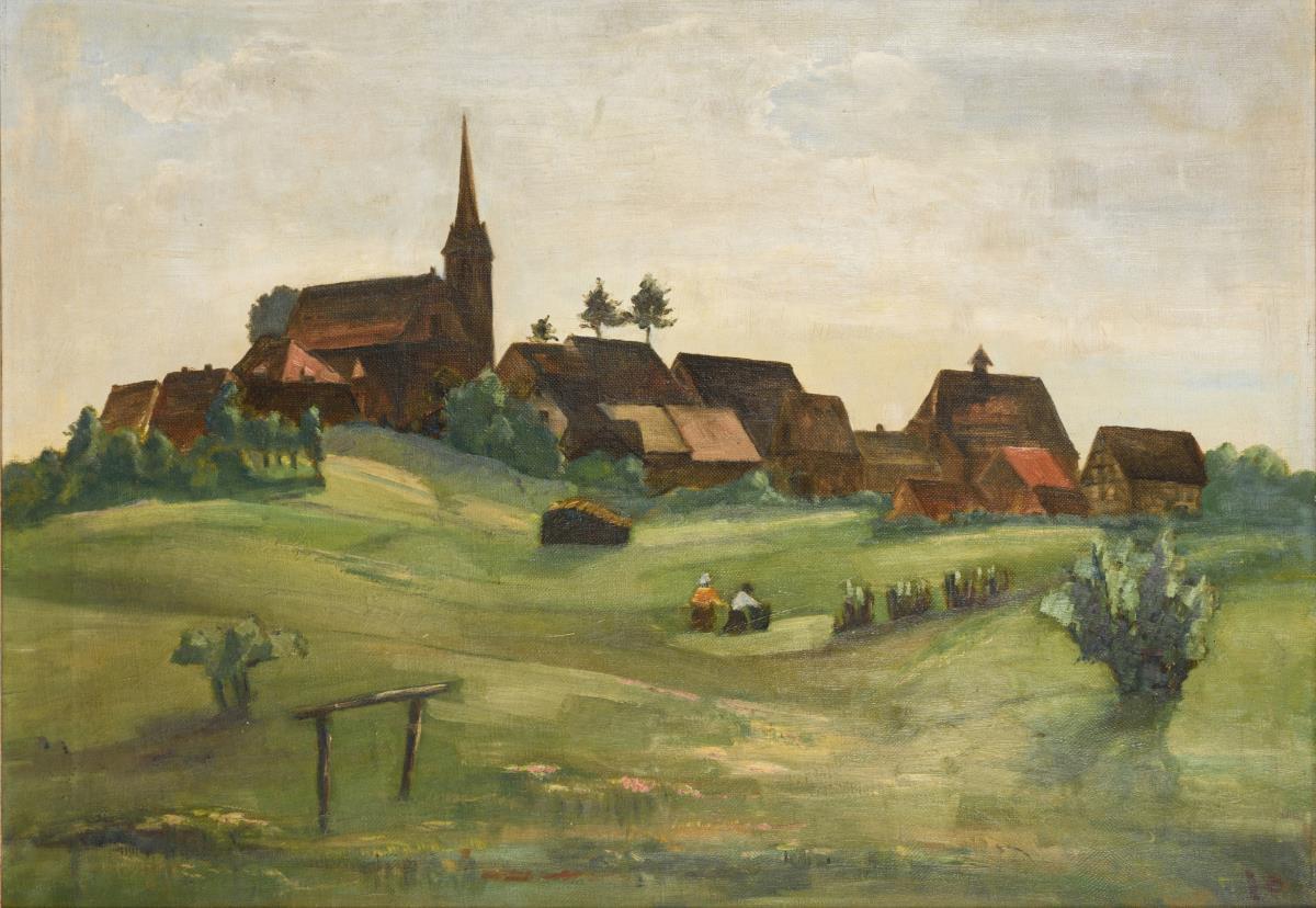 Piepho, Helmut: "Odenwalddorf". Öl/Leinwand, rechts unten "HP" monogrammiert, verso bezeichnet/betitelt. Mann und Frau vor dem Dorf auf dem Berg an einem hellen Tag unter einem bewölkten Himmel. Minimale Altersspuren. 50 x 70 cm, profilierter Silberrahmen 61 x 81 cm. .
