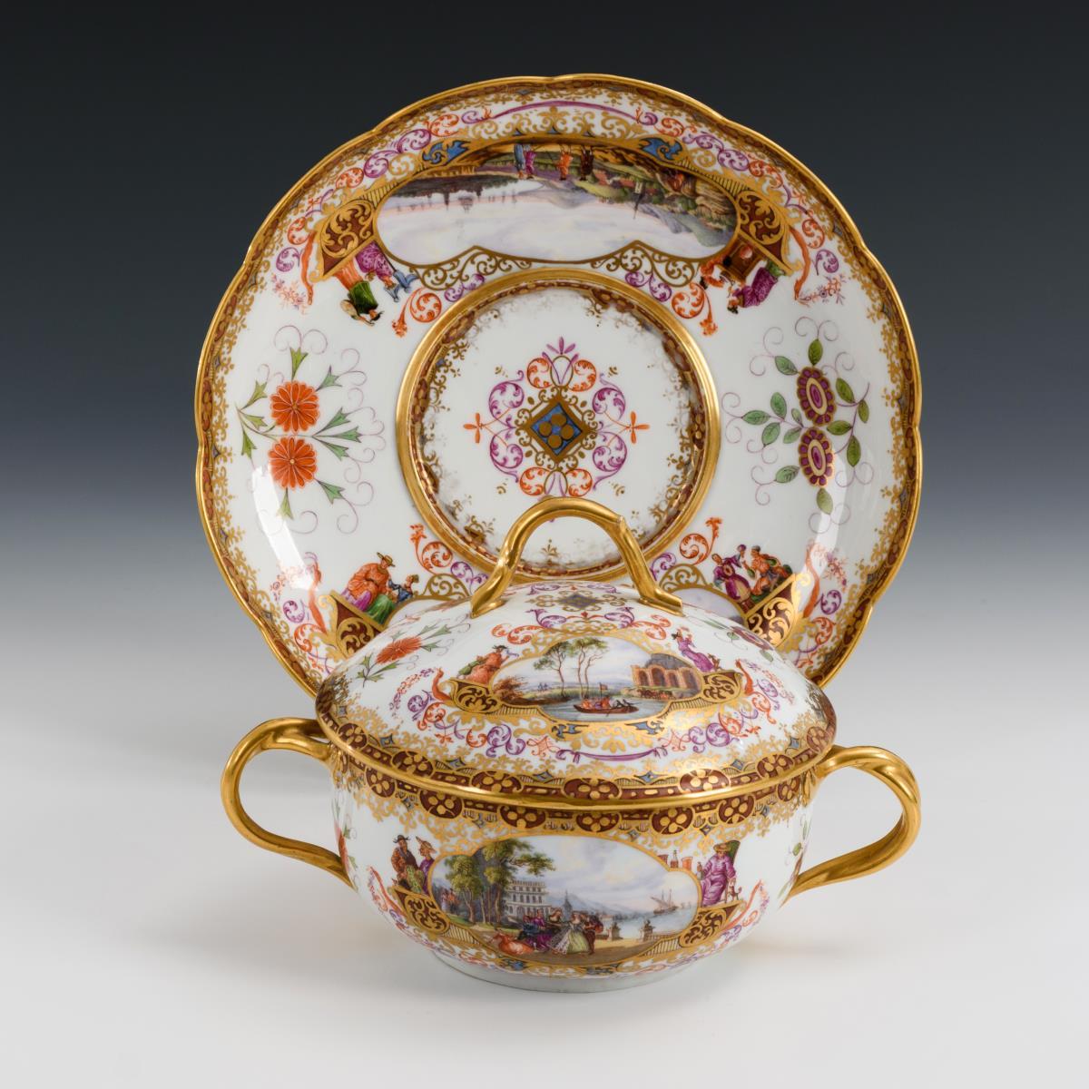 Terrine mit gewundenen Asthenkeln und Astgriffdeckel, mehrpassiges Presentoir. Auf Terrine, Deckel und Presentoir jeweils zwei von Laub- und Bandelwerk umgebene Vierpasskartuschen mit einer Fischerszene sowie der Darstellung von Vergnügungen der höfischen Gesellschaft (z.B. Entenjagd, Blinde-Kuh-Spiel, Hirschjagd). Auf den die Kartuschen flankierenden Konsolen kleine Chinesenfiguren. Partiell minimaler Goldabrieb..