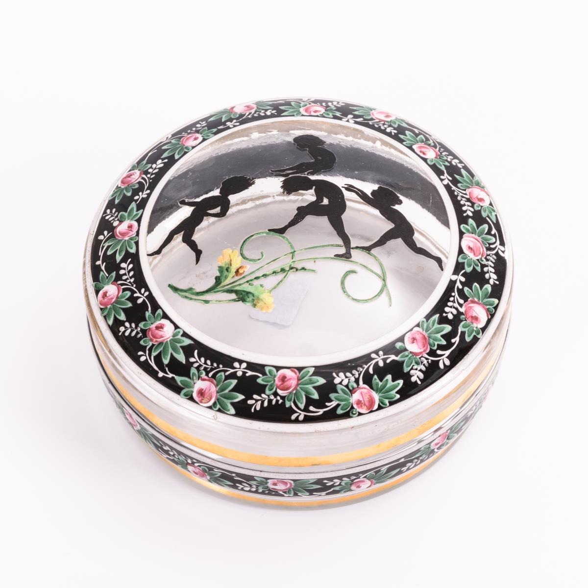 Zylindrische Dose. Auf dem Deckel in der Art eines Scherenschnittes die Darstellung von vier spielenden Kindern, auf der Wandung und am Deckelrand Röschenmalerei auf schwarzem Fondband. Minimale Randbestoßungen am Deckel- und Schalenrand.