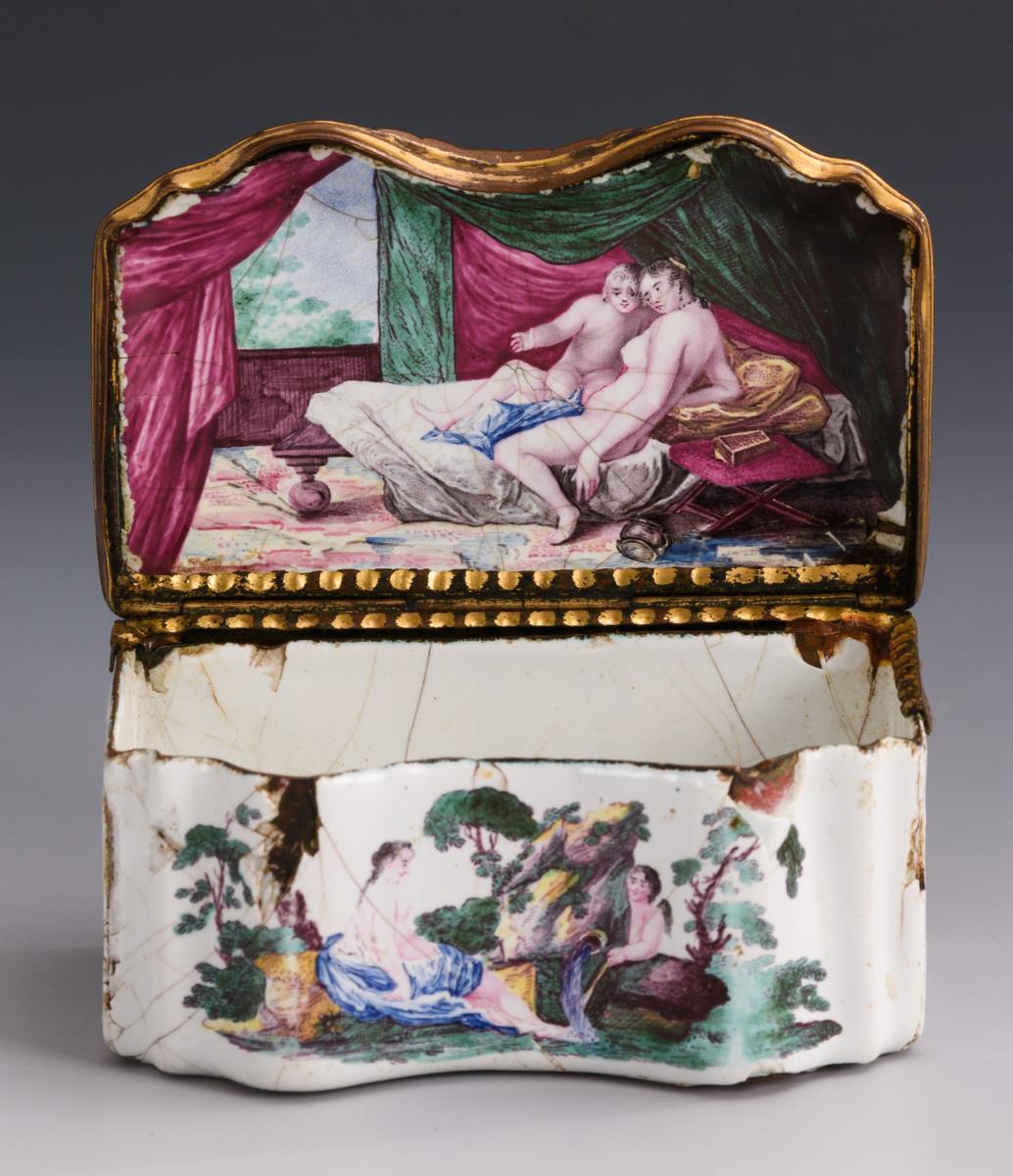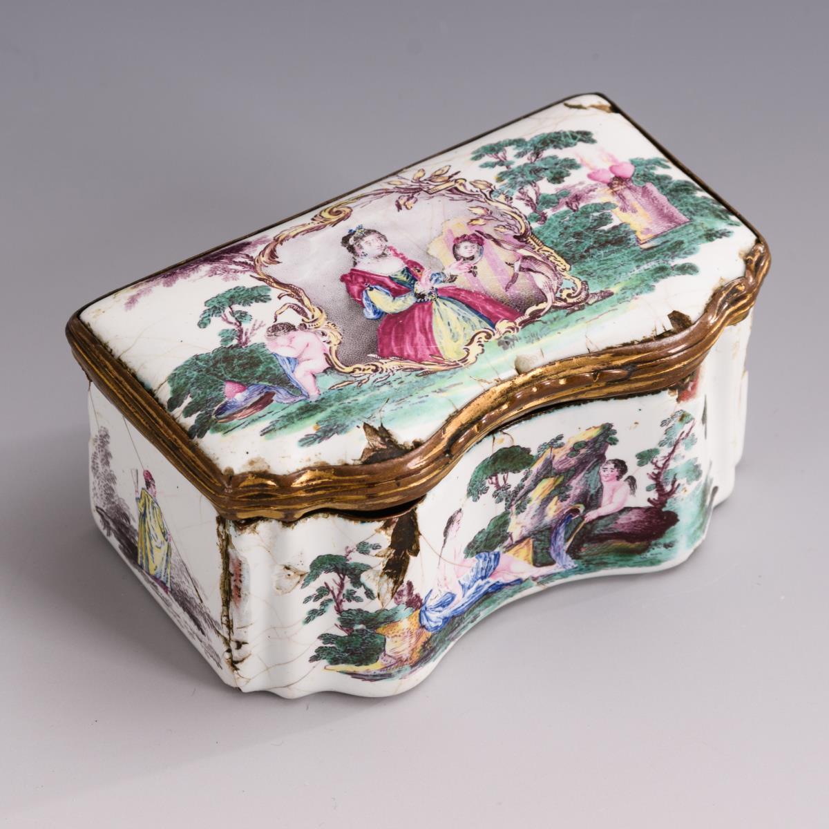 Kupferemail, Emailmalerei teils über Kupferumdruck(?), vergoldete Kupfermontierung.