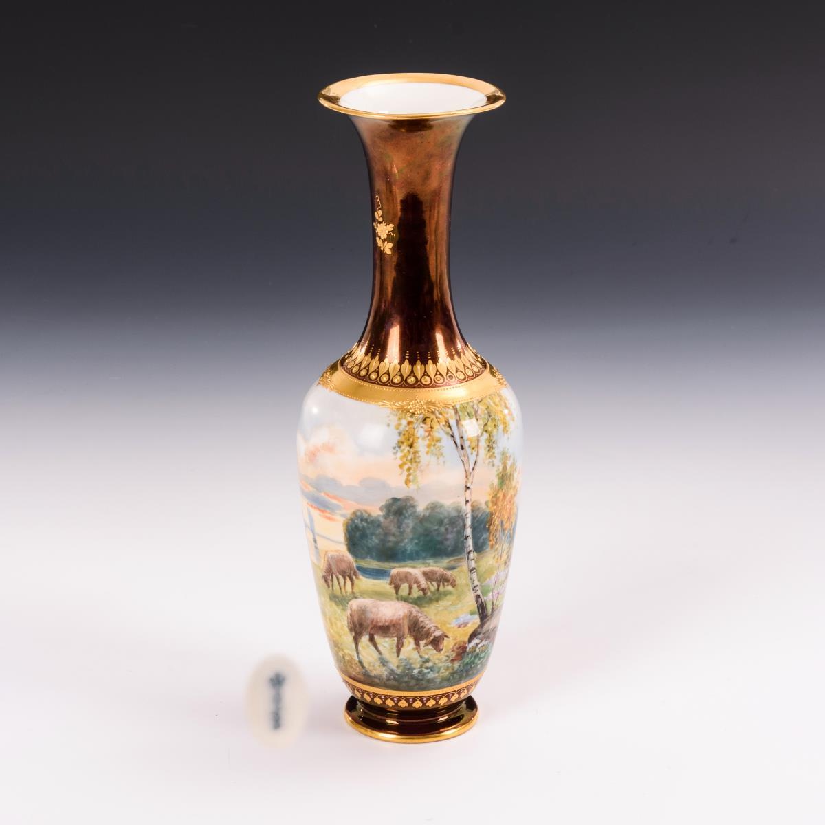Polychrome Malerei, brauner Lüsterfond, Goldreliefstaffage, Emailpünktchen.
