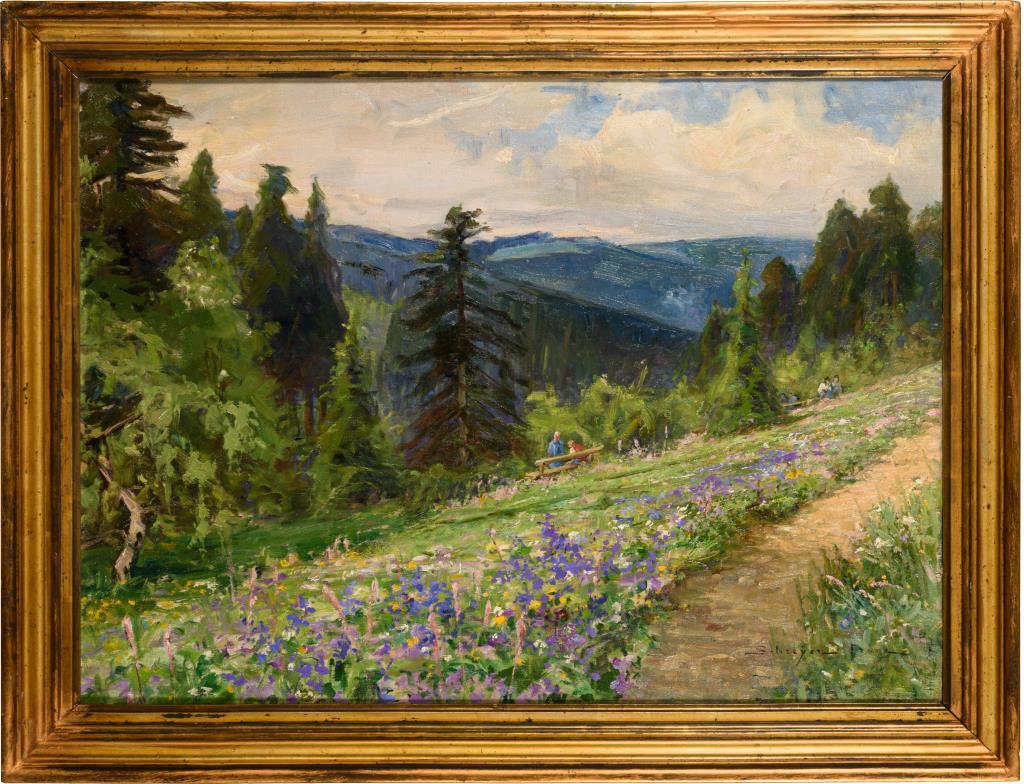 Blick von einer blühenden Wiese hinab ins grüne Tal an einem sonnigen Tag. Zwei kleine restaurierte Stellen mit Hinterklebungen.