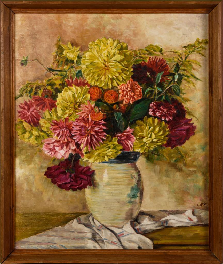 Großer Strauß aus Dahlien, Rosen und anderen Blumen. Eine kleine restaurierte Stelle.