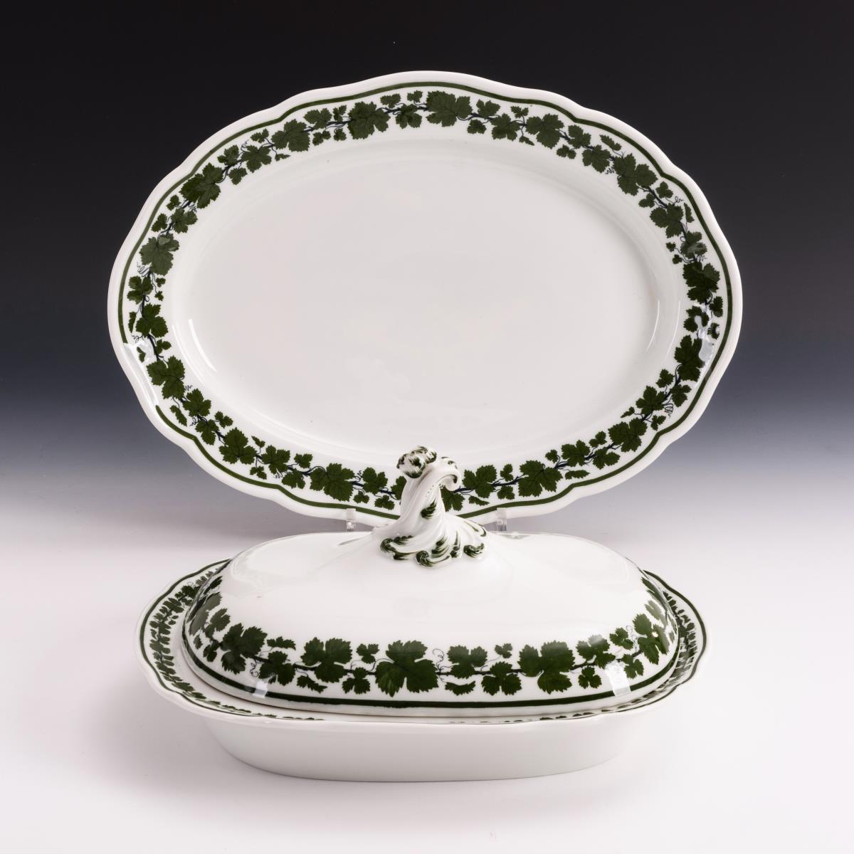 Ovalplatte und Deckelschale mit Weinlaubdekor.